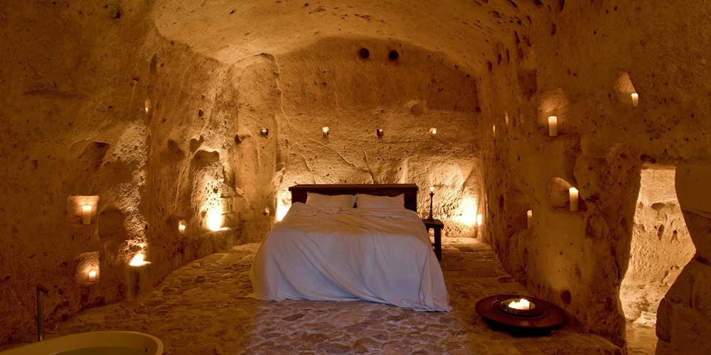 Sextantio Le Grotte della Civita, en los Sassi di Matera, Italia, es un hotel en cuevas paleolíticas restauradas del siglo IX a.C., donde habitaciones con frescos romanos y camas de piedra se iluminan con velas para noches que evocan la prehistoria. Su restaurante en cueva sirve cocina lucana en mesas talladas en roca.