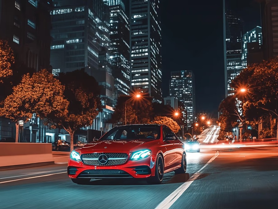 El Mercedes-Benz E-Class del 2025, con un precio inicial de $63,500, cuenta con matrix LED Digital Light de 1.3 millones de píxeles por faro, dibujando señales en la carretera.