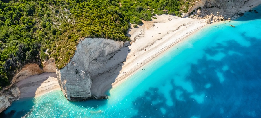 Fteri Beach, en la costa noroeste de Zakynthos, Grecia, es un acantilado de 50 metros con una playa de arena blanca y aguas esmeralda, restringida a 20 visitantes diarios por sendero empinado o bote, protegiendo su flora endémica y tortugas marinas. Sus calas ocultas y acantilados calizos son un edén jónico.